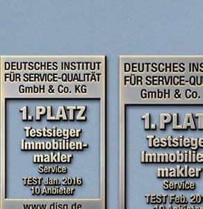 Wir stehen seit 30 Jahren für höchste Qualität in der Vermittlung besonderer Immobilien und streben immer nach dem besten Ergebnis für unsere Kunden. Der Fokus auf Servicequalität und Innovationskraft ist uns dabei besonders wichtig. So können wir unseren Kunden das umfangreichste Spektrum an Serviceleistungen und Marketing-Tools zur Verfügung stellen. Dies verdeutlicht auch unsere neueste Auszeichnung durch das Deutsche Institut für ServiceQualität, das uns zum 4. Mal in Folge zum Testsieger Immobilienmakler ausgezeichnet hat.