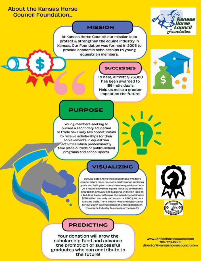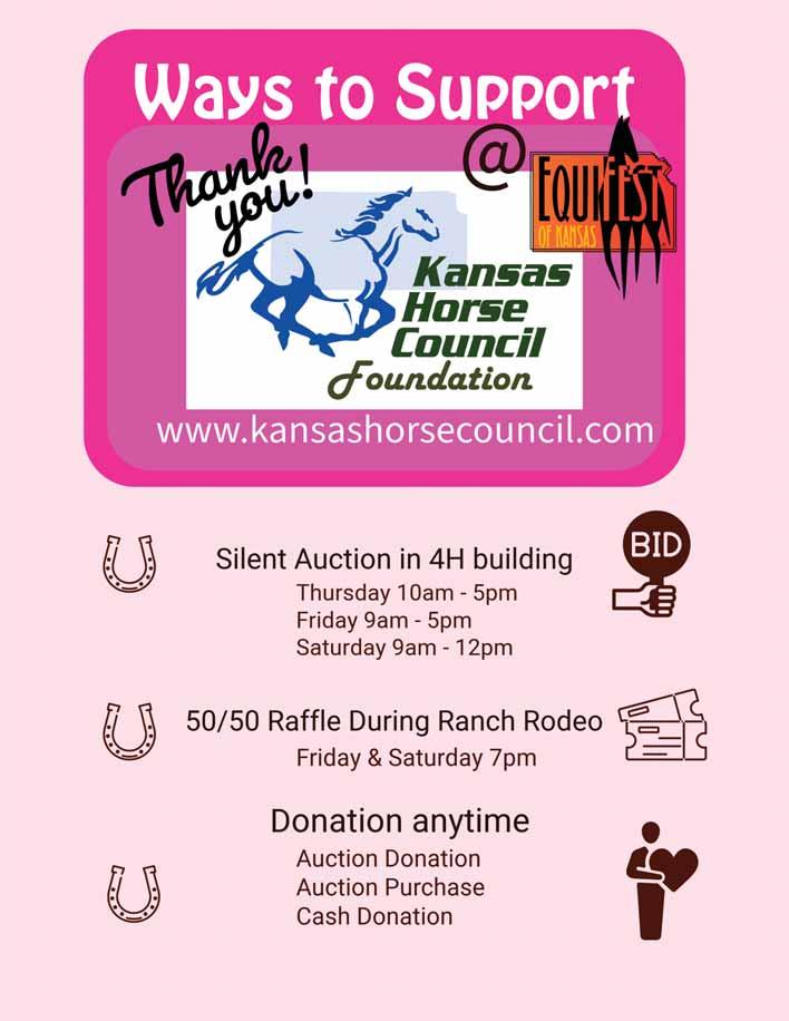 Foundation Silent Auction is a tradition serving as the primary academic scholarship fundraiser for equestrian youth in Kansas. Visit and support Thursday, Friday and Saturday. Another opportunity to support includes the 50/50 raffle during the Ranch Rodeo. Our Kansas Rodeo Royalty are actively involved in supporting the Kansas Horse Council Foundation Scholarship fundraising. If you have questions, be sure to talk to one of these outstanding representatives!