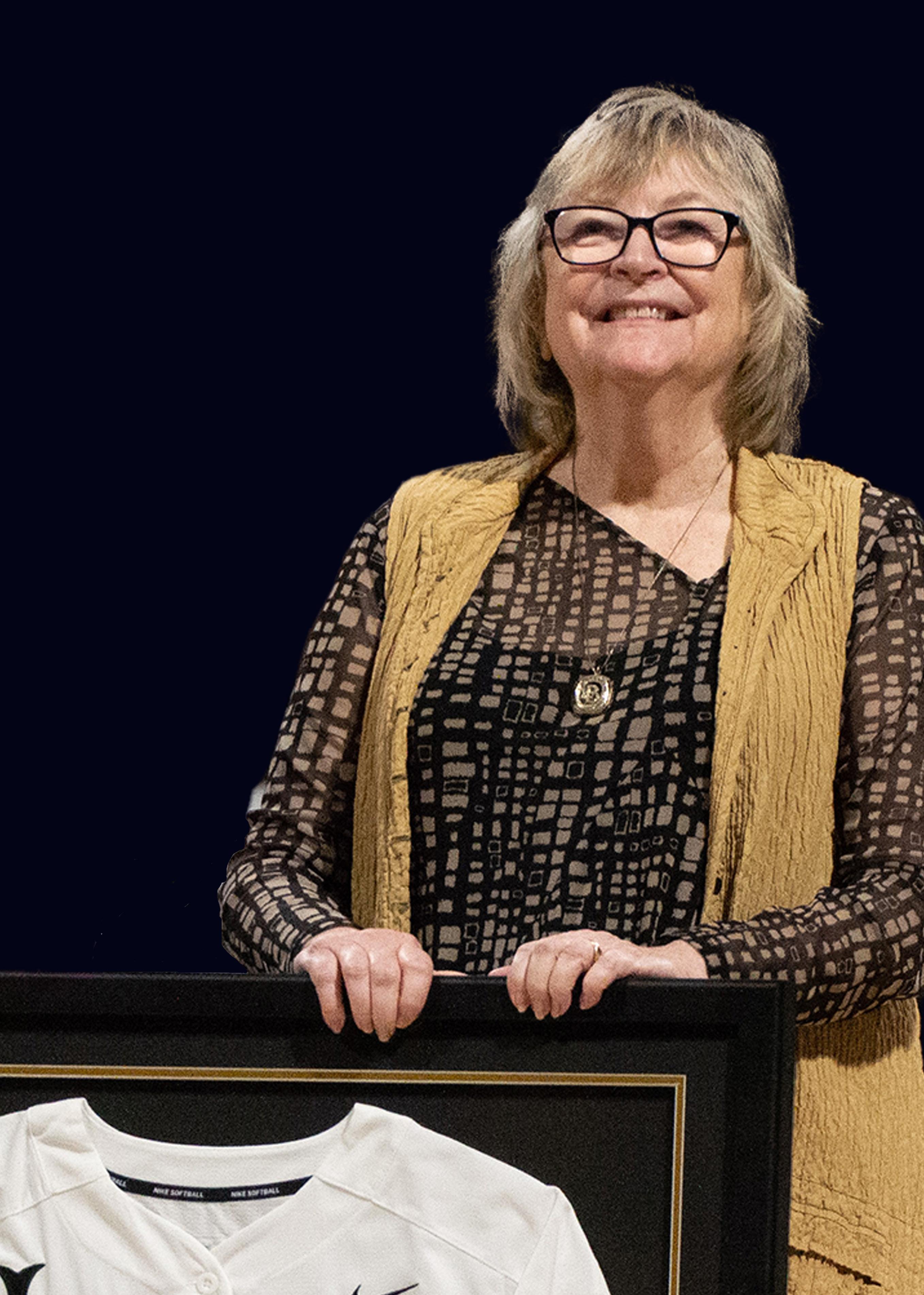 Long Beach State University President Jane Close Conoley will celebrate 10 years as president this spring 2024 semester. She was announced as the new president in January 2014 and took over the job in July of that year. She is pictured in October 2022 presenting CSULB employee Cindy Masner with a commemorative jersey at Walter Pyramid.