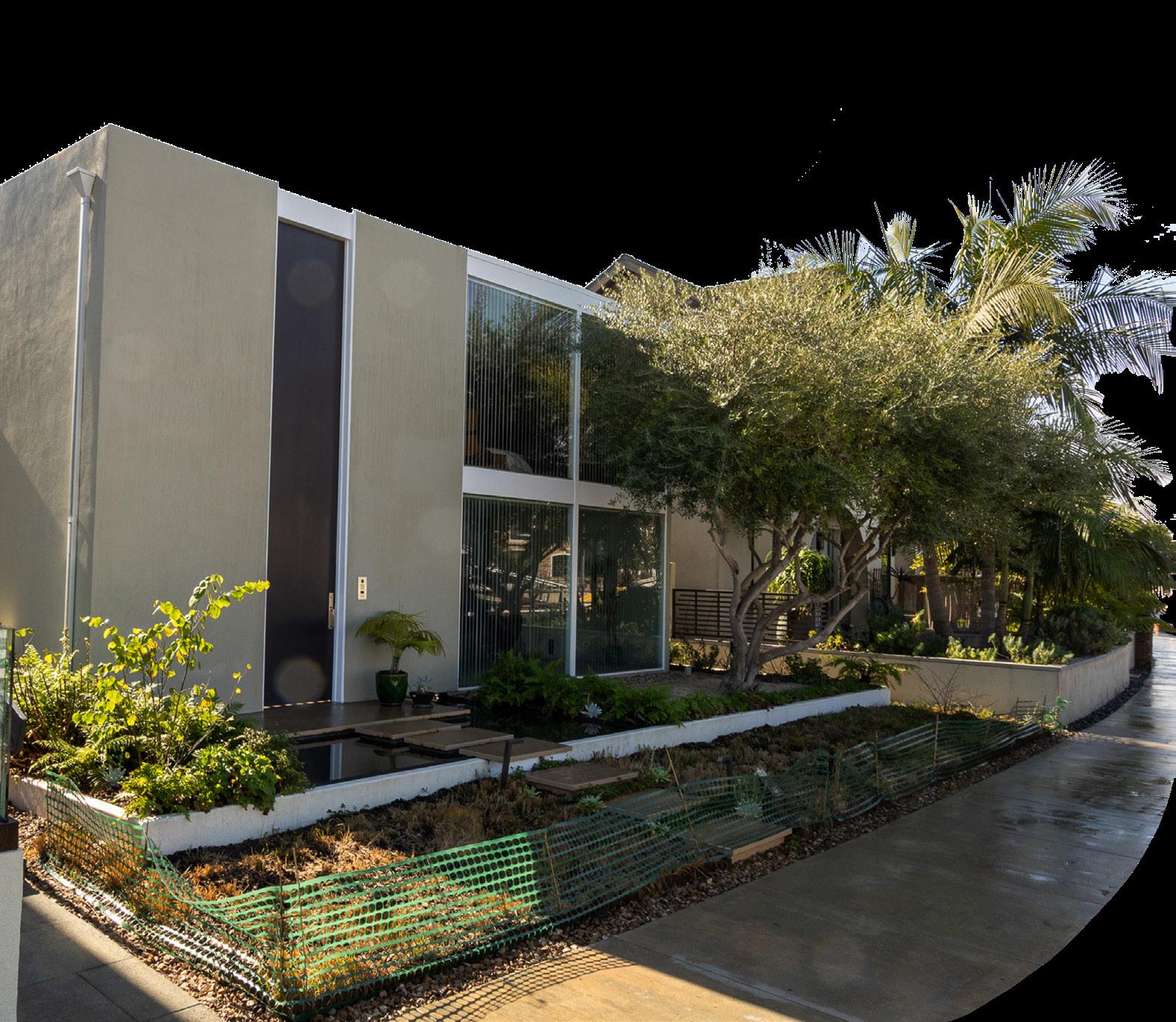 The two-story minimalist home overlooks the Rivo Alto Canal on Naples Island and was designed by architect Edward Killingsworth, who also designed much of CSULB. Stone steps lead to the 17-foot-tall front door that opens up to a courtyard surrounded by water. Walls are replaced with glass windows that create transparency to rooms on both floors of the house.