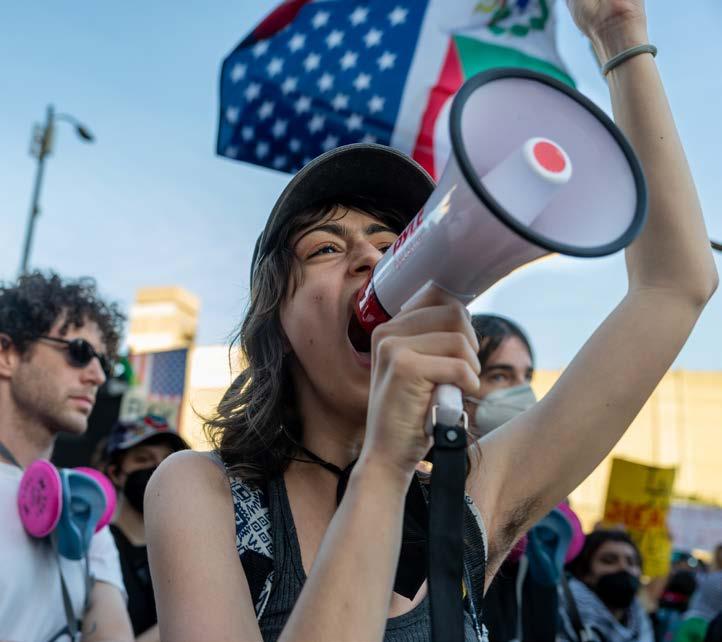 A protester chants through a megaphone at the Metropolitan Detention Center in Los Angeles on Jan. 30. Protesters frequently gather at the federal MDC building since it is known to house immigration detainees.