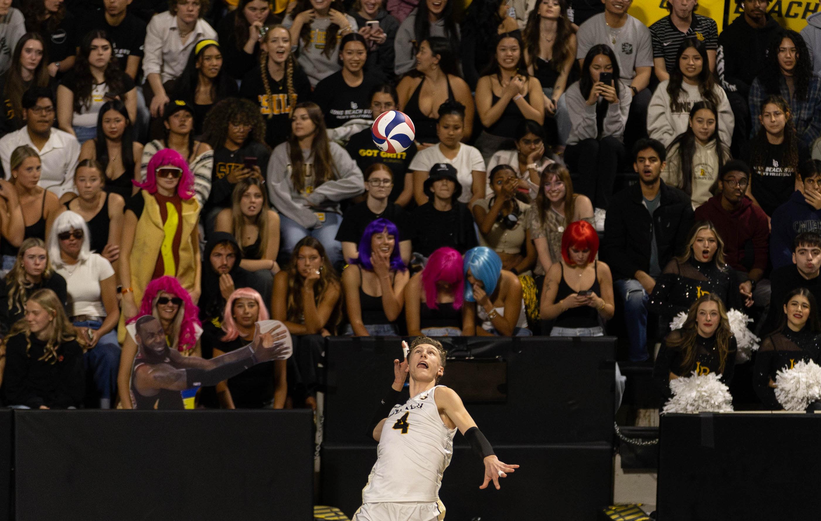 LBSU opposite hitter Skyler Varga serves up the ball against UCLA with over 1,000 students packed in the stands. Varga is one of the many men’s volleyball players who benefit from the men’s volleyball NIL collective.