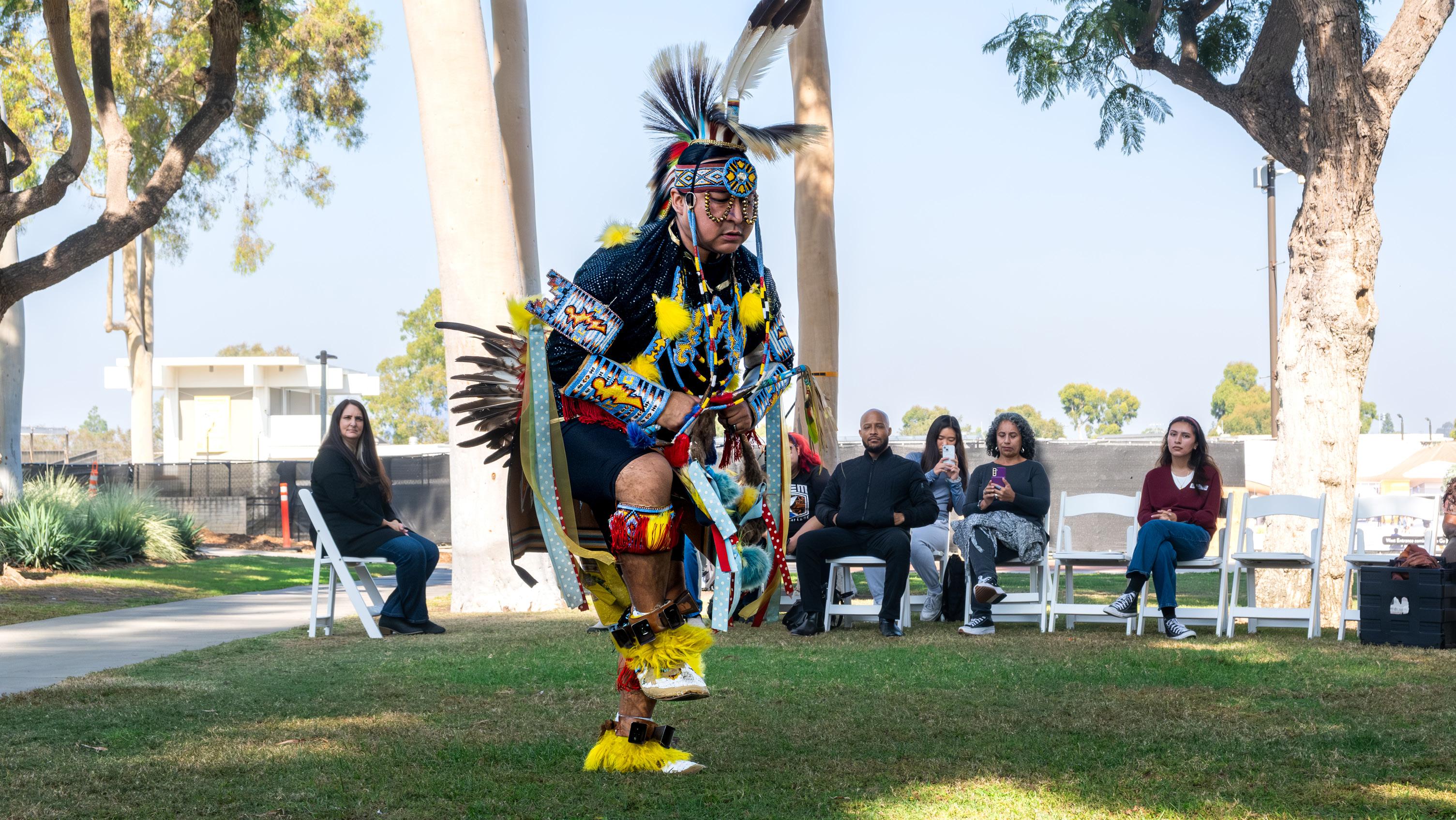 Shiigo Biiliilitso Navajo a CSULB alumnus ‘21, danced the Men’s Prairie Chicken during the "Native American Heritage Month Kickoff" event on Nov. 4.