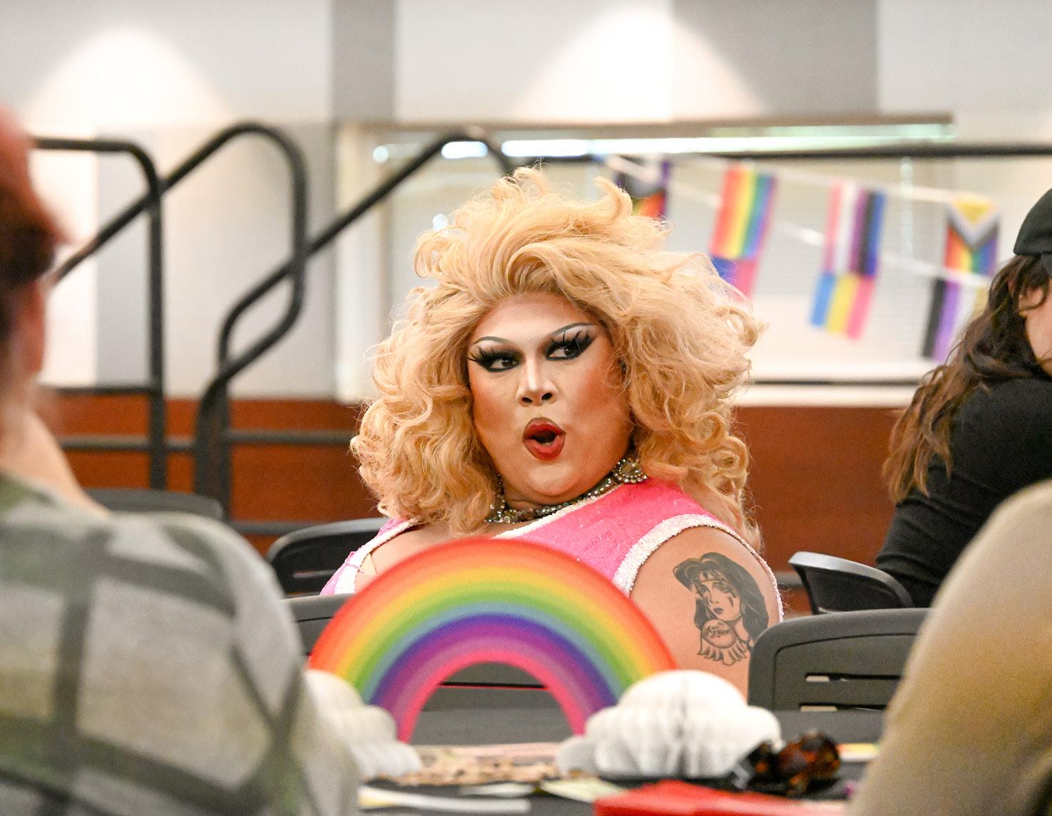 REHANSA KULATILLEKE/Long Beach Current CSULB alumnus, Natasha Hundreds performs Chappell Roan's hit song, "Good Luck, Babe!" during CSULB's Drag Loteria in celebration of OUTober at The Pointe on Oct. 7.
