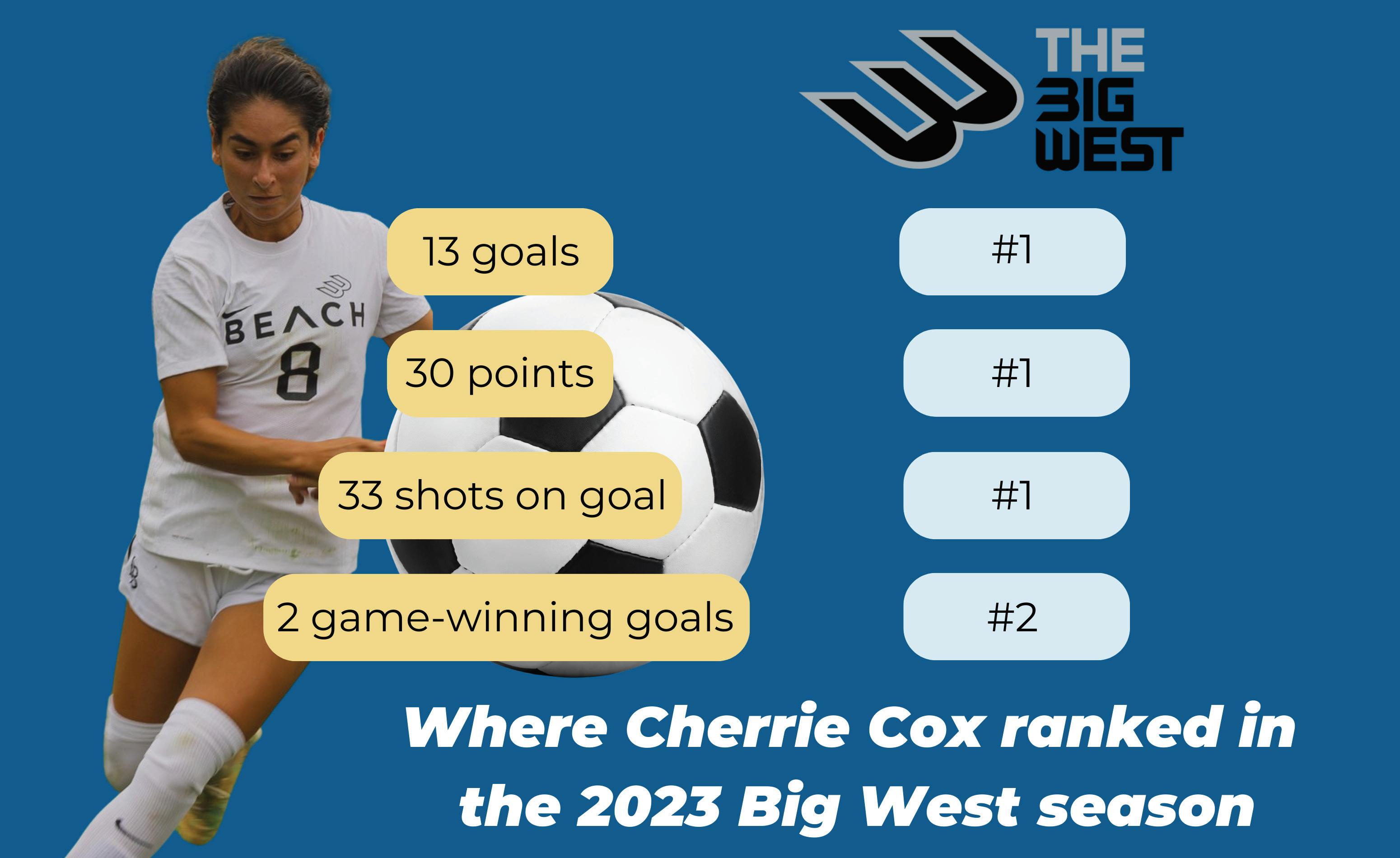 Beach Current Long Beach State junior forward Cherrie Cox was named the 2023 Big West Offensive after ranking first in most goals, points, shots on goal and ranking second on scoring two game-winning goals.