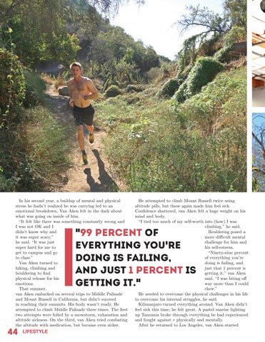 He attempted to climb Mount Russell twice using altitude pills, but these again made him feel sick. Confidence shattered, van Aken felt a huge weight on his mind and body. “I tied too much of my self-worth into (how) I was climbing,” he said. Bouldering posed a more difficult mental challenge for him and his self-esteem. “Ninety-nine percent of everything you’re doing is failing, and just that 1 percent is getting it,” van Aken said. “I was biting off way more than I could chew.” He needed to overcome the physical challenges in his life to overcome his internal struggles, he said. Kilimanjaro turned everything around. Van Aken didn’t feel sick this time; he felt great. A pastel sunrise lighting up Tanzania broke through everything he had experienced and fought against – physically and mentally. After he returned to Los Angeles, van Aken started