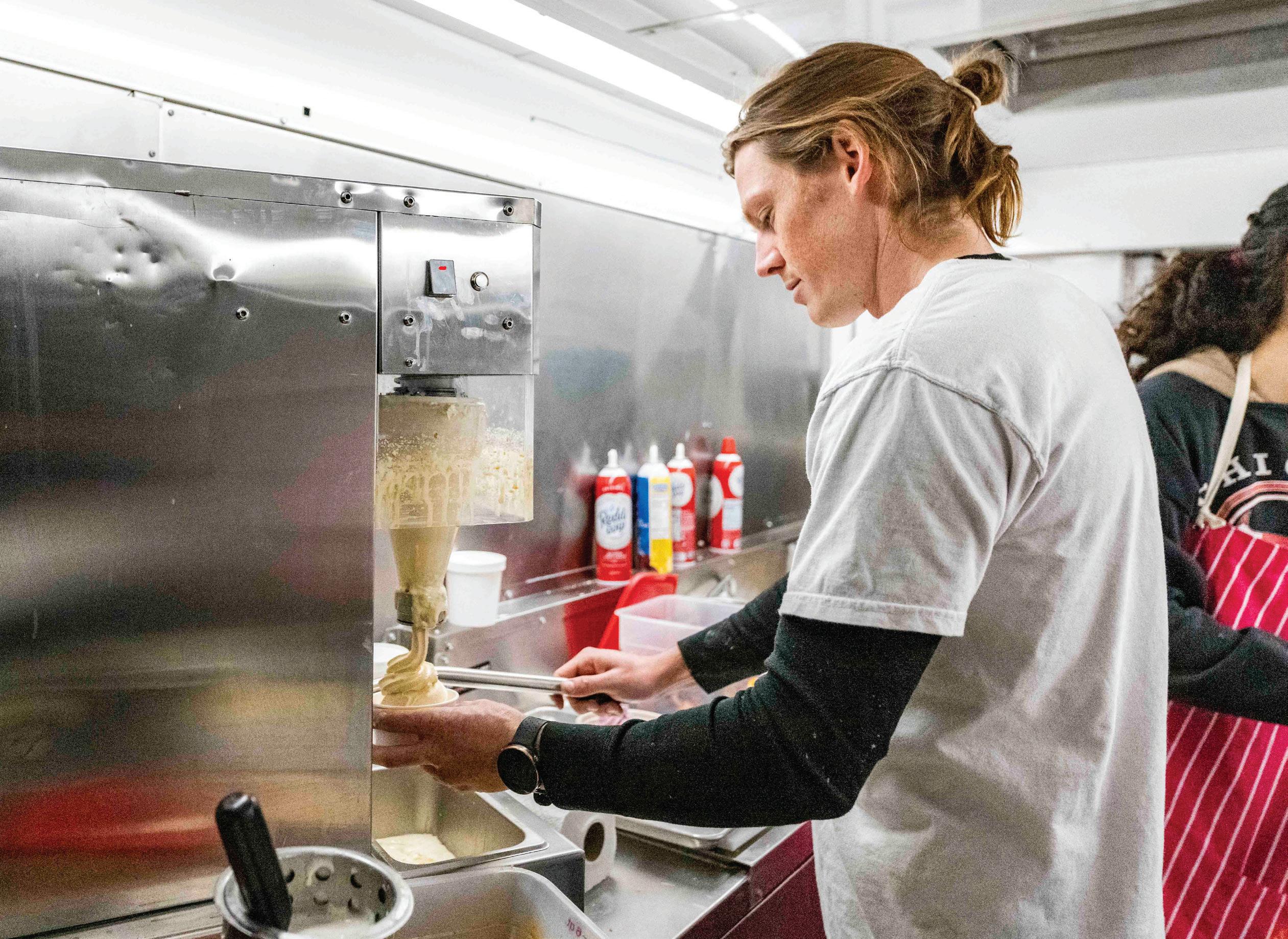 The inside of the Creamy Boys truck resembles a hybrid between a garage band studio and a mechanized conveyor belt. Despite the trailer’s cramped conditions, each team member seamlessly assumed their unique role in the ice-cream-making process. Standing center stage in a cheerful blue-striped apron, Duncan Parsons conducted the controlled chaos of Creamy Boys with each pull of the ice cream machine’s lever.