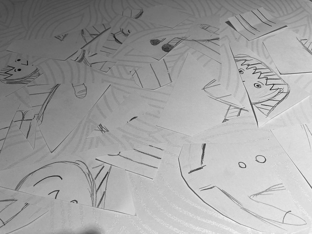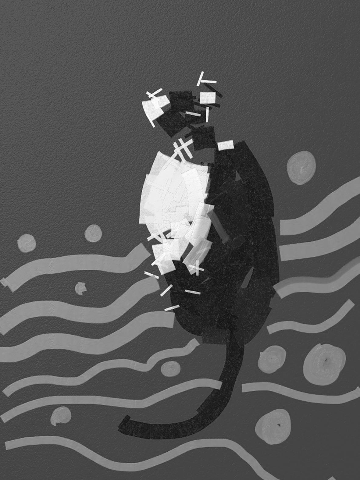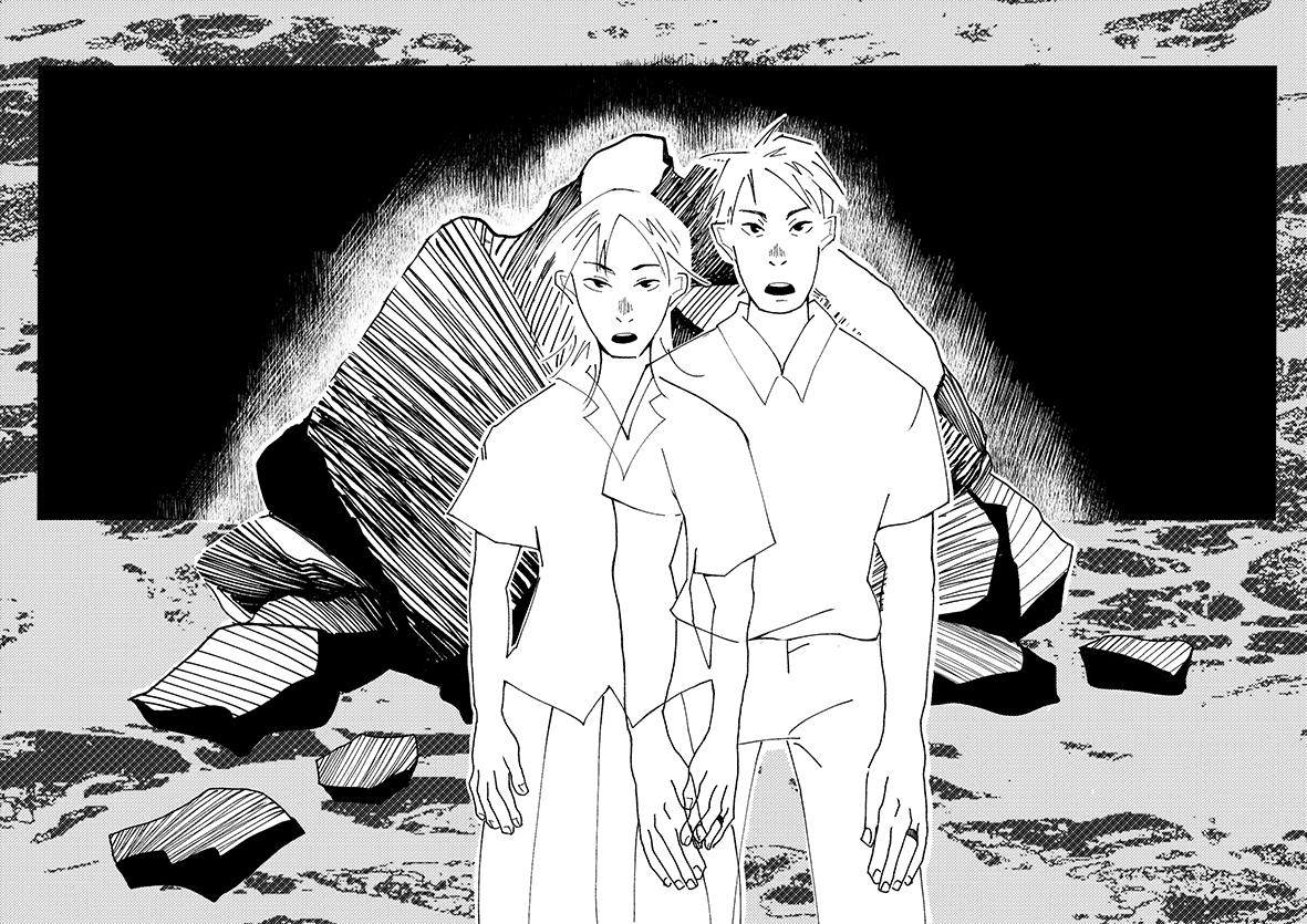 因為不知道要做什麼 ,我覺得自己沒有問題 ,彷 彿一切都已經有了自己的答案 ,做議題也只是迷 幻魔咒 ,所以把自己小時候寫的小說跟日記都翻 了出來 ,翻著翻著翻到了一場夢......在那場夢裡我 是海的丈夫 ,為了和人類女子交歡而逃至內陸 , 內陸沒有海 ,偶見破碎的浪花......於是以這樣的設 定為起點 ,並試著用漫畫描繪了極短篇故事 ,看 看主角能逃到哪裡去 。