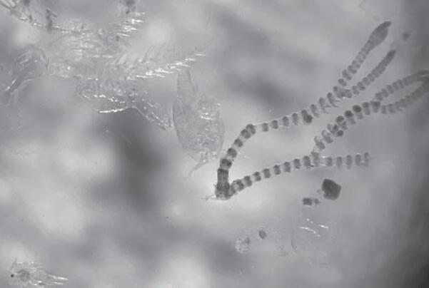 1969 年 , 祖父在復中輪船上 擔任船員,一趟從台灣出發 的中美貿易航線,在中途抵 達美國密西西比河時,與一 艘油輪船對撞,祖父和復中 輪船沉入密西西比河底。我 想像,祖父和沈船、魚類、 海底生物,自此形成一個新 活動。祖父生命的另一面由 此展開。祖父和浮游動物皆 是以人類肉眼看不見得那一 群,浮游動物需要透過顯微 鏡發現他們的存在,此刻顯 微鏡也彷彿是帶我通往祖父 另一個存在的空間;裡面有 浮游生物,或許也有祖父的 影子。而牽引我趨近海底的 念頭,是祖母在訴說這些故