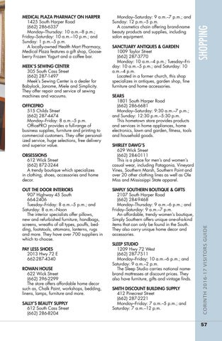 MEDICAL PLAZA PHARMACY ON HARPER 1425 South Harper Road (662) 286-6337 Monday–Thursday: 10 a.m.–8 p.m.; Friday–Saturday: 10 a.m.–10 p.m.; and Sunday: 1 p.m.–5 p.m. A locally-owned Health Mart Pharmacy, Medical Plaza features a gift shop, Gooseberry Frozen Yogurt and a coffee bar. MEEK’S SEWING CENTER 305 South Cass Street (662) 287-1497 Meek’s Sewing Center is a dealer for Babylock, Janome, Miele and Simplicity. They offer repair and service of sewing machines and vacuums. OFFICEPRO 515 Childs Street (662) 287-4474 Monday–Friday: 8 a.m.–5 p.m. OfficePRO provides a full-range of business supplies, furniture and printing to commercial customers. They offer personalized service, huge selections, free delivery and superior value. OBSESSIONS 612 Wick Street (662) 872-3244 A trendy boutique which specializes in clothing, shoes, accessories and home decor.