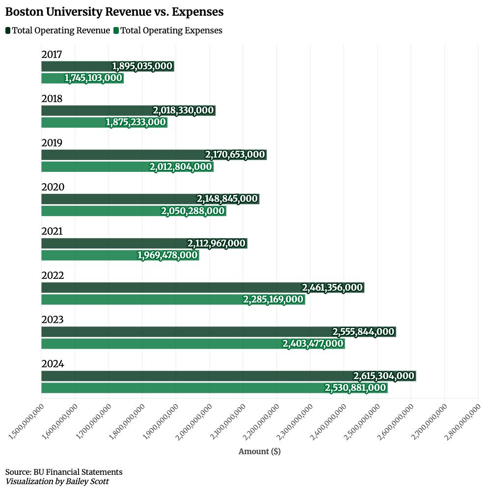 University expenses are growing annually by an average of 5.6% since 2017, while revenue is growing at an average 4.8% per year over the same period of time, according to BU officials and documents obtained by The Daily Free Press.