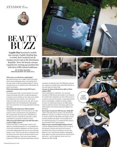 renewal on a molecular level. Oral CBD drops improve your organs on a cellular level; using CBD products on your skin does the same thing. Can you use these products just as often as those without CBD? There’s absolutely no restriction. You can never overdose on CBD! We put just enough in our products. It’s overkill when companies use more. What we put in is what you need. My formulator is really experienced— she’s an herbologist, in addition to being a healer. So when we made these products, we talked about what we wanted to achieve—anti-aging, getting rid of inflammation, cell renewal, improving collagen, and hydrating. How do you incorporate CBD into your daily life? I take it internally and on my skin; I see and feel the difference. Actually, I use CBD on my dog, too. He likes it! I think it makes him feel better. He’s happy, and his stomach problems get better. A lot of people use it for medicinal purposes. It’s a medicinal herb; there is actual evidence that it heals diseases. What are your essential Cygalle daily products? I like the colloidal oatmeal cleanser from my natural line because I have dry skin and a bit of eczema sometimes from stress. It’s gentle on my skin, and balances it out. I also like the cranberry antioxidant toner, alpine rose stem cell moisturizer, and the lemon basil tonic. I use the hyaluronic serum, too; it’s a popular one right now.