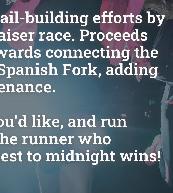 Join us for our annual fundraiser to improve our trail system. All proceeds from the marathon go toward future amenities, maintenance and connection to the trail system in Spanish Fork. In this unique nighttime race, runners can start running whenever they want. No timing devices are allowed, and the winner is whoever crosses the finish line closest to midnight. Awards are given for the best light-up costumes, and there’s an afterparty with prizes, food and glow-in-the-dark fun.