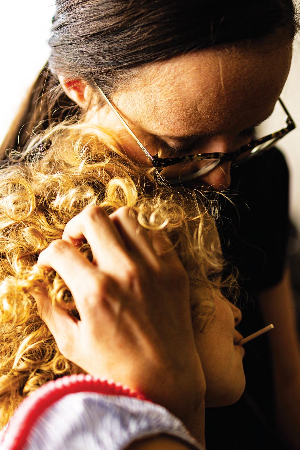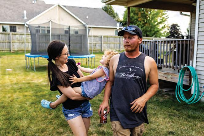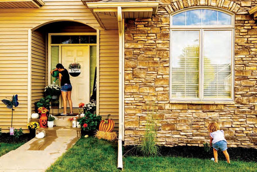 Lexie Olgren, 28, and her daughter, Isabelle, 4, water a plant they bought together at the Olgren family home in Ankeny, Iowa, on Sept. 14.