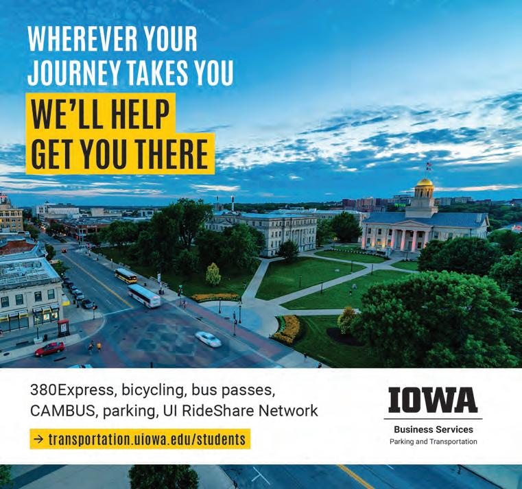 The Daily Iowan (USPS 143.360) is published by Student Publications Inc., E131 Adler Journalism Building, Iowa City, Iowa, 52242-2204. Printed Wednesdays during the fall and spring semesters, plus Fridays during football season. Continuous news updates on dailyiowan.com 3 NAVIGATING CAMPUS 4 | Looking back on the year 7 | UI’s ten year master plan Fun facts 8 | Study spots Course materials 9 | Diversity at Iowa Student Disability Services 10 | First-generation Hawkeyes 11 | Health resources 12 | Sexual misconduct Safe spaces on campus 14 | President Barbara Wilson 17 | Board of Regents University of Iowa leaders 19 IOWA CITY LIFE 23 | Iowa City’s Pedestrian Mall Shopping spots 25 | Music venues and theatres 26 | Dining hotspots Historic museums 27 | Finding a job 28 | When the parents are in town Old Capitol Mall 29 | Managing funds Financial independence 31 | Co ee shops 33 | Transportation 35 | Campus map