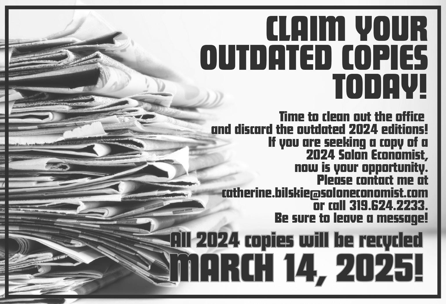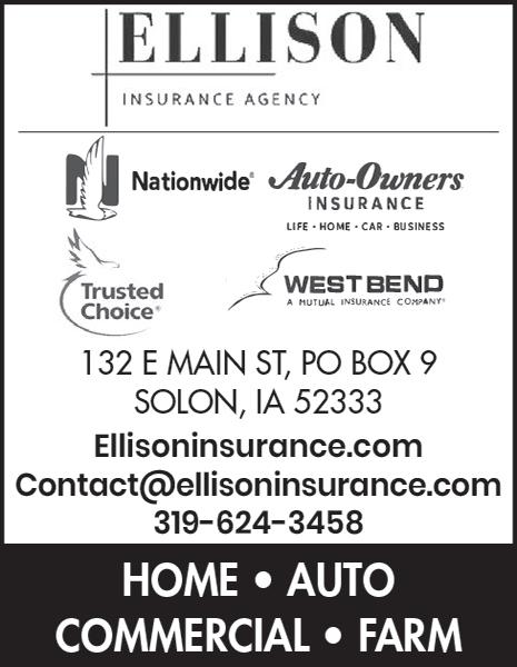 249, Solon, IA 52333. Subscriptions: Contact Catherine Bilskie at 319-624-2233 or catherine. bilskie@soloneconomist.com for additional information. Subscription rates: Johnson and adjoining counties – $55 annually; elsewhere In Iowa – $75 annually; out of state –$85 annually.