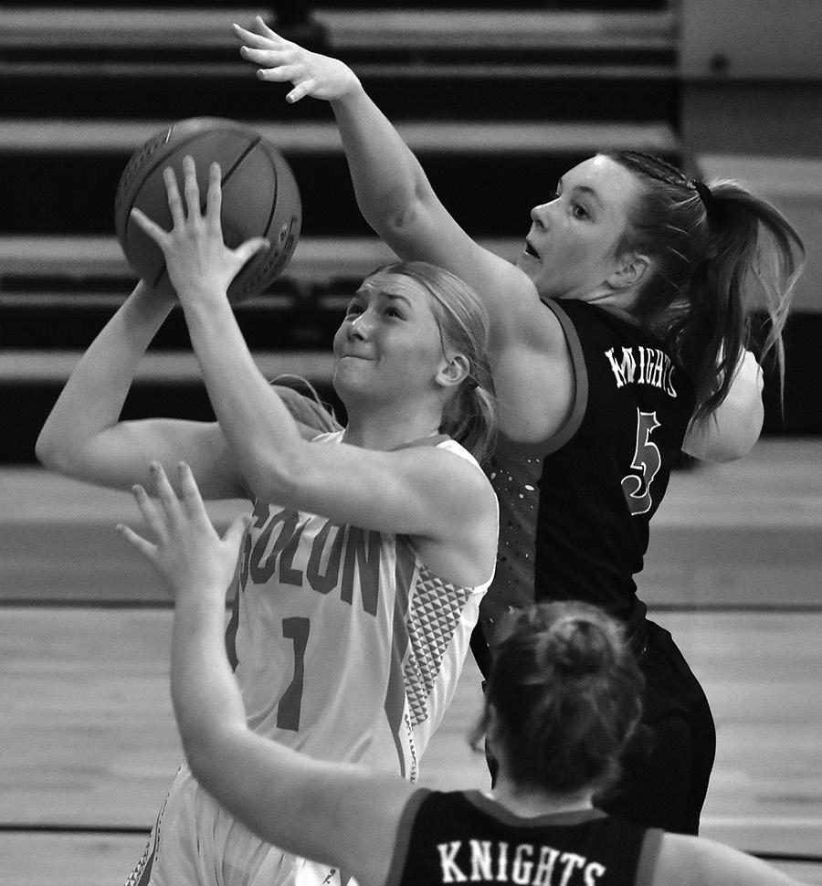 Left: Kobi Lietz (1) puts up a shot under pressure from Assumption’s Ella Curoe (5) in Saturday’s Class 3A Region 1 Quarterfinals game in Solon. The Lady Spartans topped the Knights 51-39 to face Mt. Vernon Wednesday, Feb. 19 in the Mustangs’ stable.
