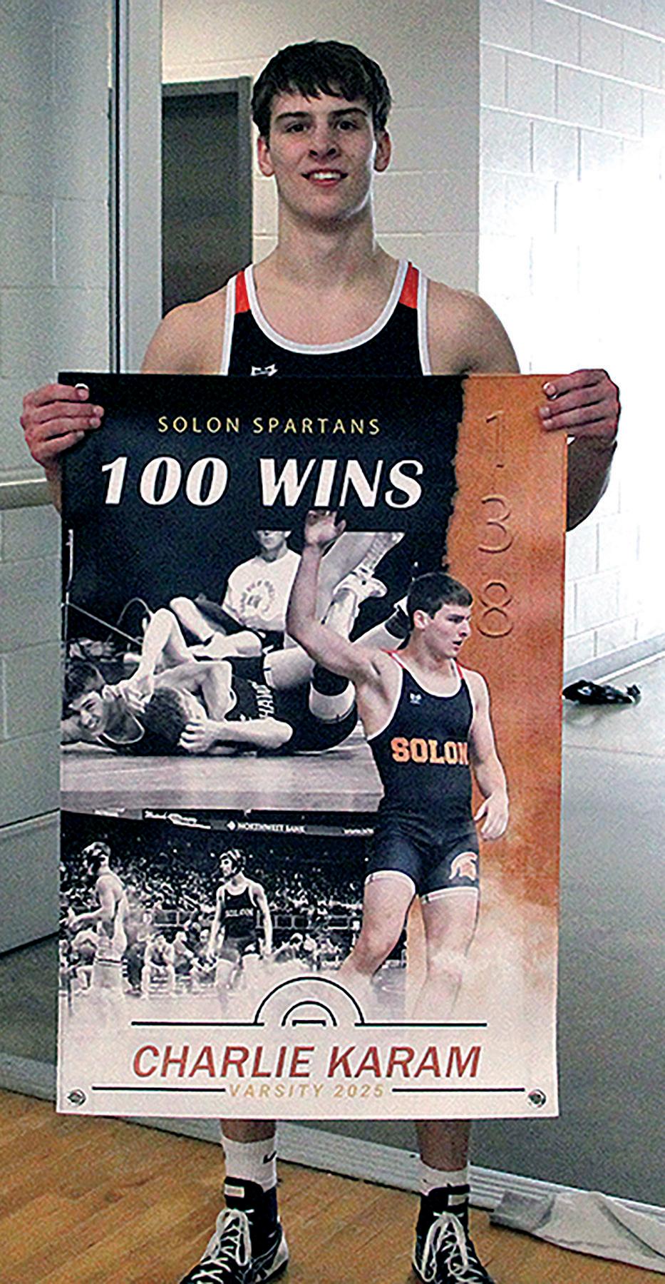 Solon’s Charlie Karam poses for a photo with a banner celebrating his 100th career win. Karam took a 16-1 technical fall against Washington’s Jude Carter in the semifinals and advanced to the State Tournament with a 2nd Place finish at 138 pounds.