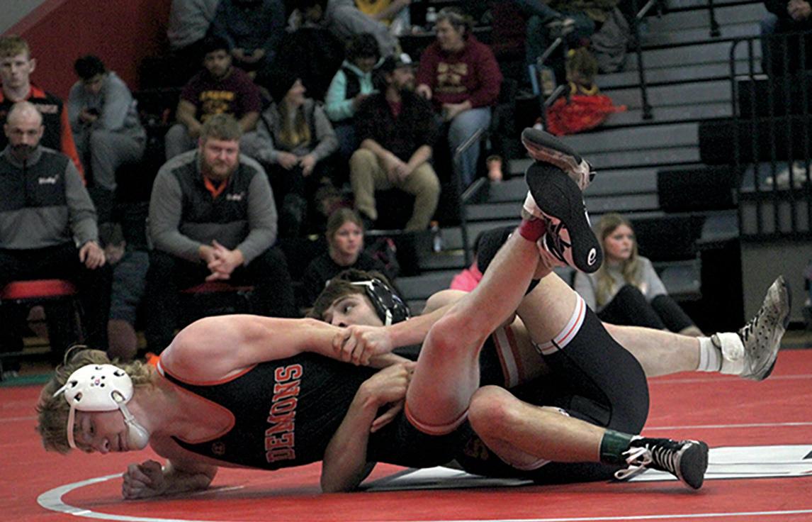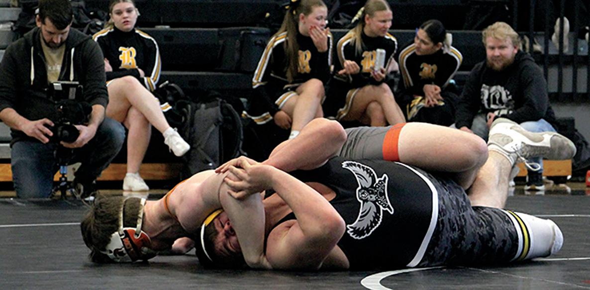 Right: Solon’s Kyler Jensen and Mid-Prairie’s Brock Fisher wrestle during 2A Districts at Williamsburg High School Saturday, Feb. 15.