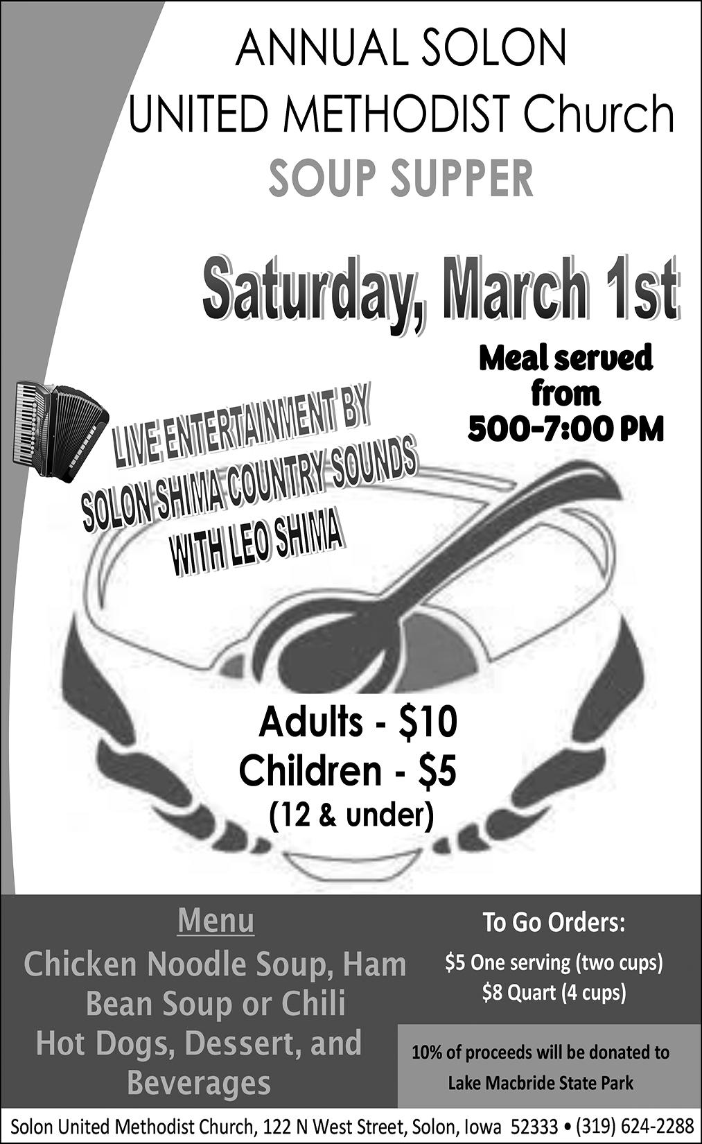 The Solon Community Food Pantry will host a vaccination clinic Monday, March 3, 2-6:00 p.m. at the pantry located in the basement of the Solon Methodist Church, 122 N. West St., Solon. Eligibility criteria applies to receive the vaccines.