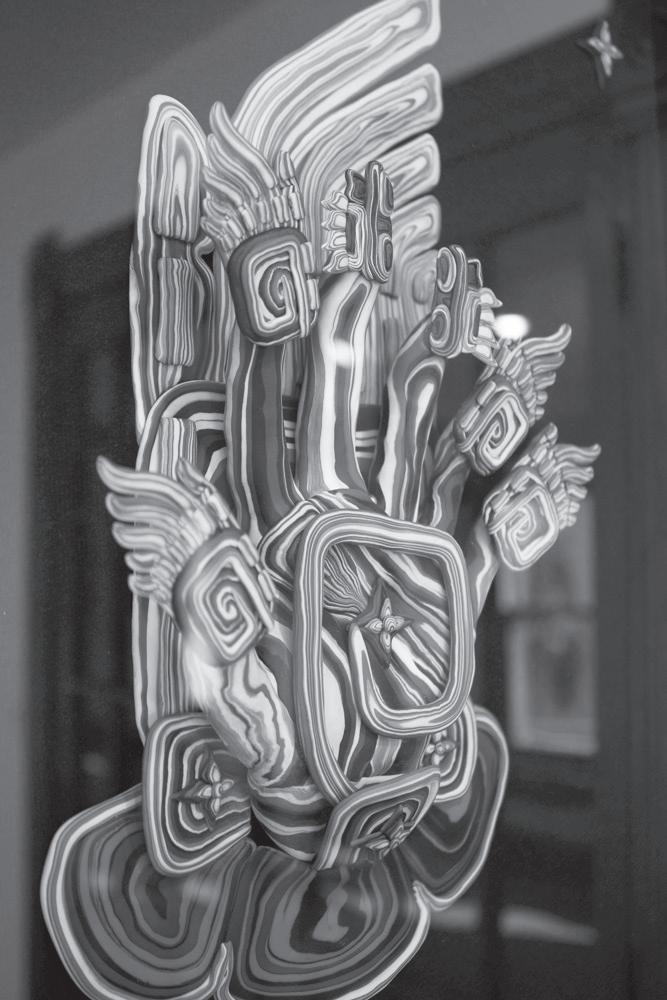 Made from polymer clay and an obsidian mirror, it consisted of a brightly-colored green and orange mirror above a purple water basin. The mirror itself was set inside an intricately tied knot from which two figures intertwined above it.