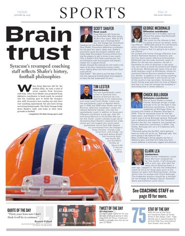 hen Doug Marrone left for the Buffalo Bills, he took a total of seven coaches from Syracuse with him. After Scott Shafer was promoted from defensive coordinator to head coach, he reached into his coaching past to build the Orange’s new staff. Syracuse’s new coaches not only have vast coaching experienced, but also have strong recruiting backgrounds. The Daily Orange broke down Shafer’s staff, and looks at their backgrounds in football. —Compiled by The Daily Orange sports staff