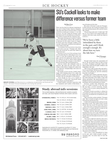 Though Cockell enjoys the camaraderie off the ice, she also knows when it’s time to focus on hockey. Freshman goaltender Kallie Billadeau said Cockell has brought confidence and leadership to the team. “She’s been tough on girls when she had to, but it’s a good thing,” Billadeau said. “Everyone needs a little pick-me-up, and she’s definitely been that vocal leader.” Flanagan said Cockell’s experience has provided a boost for a young Orange team. He has also taken advantage of her ability to play both offense and defense. She played primarily as a defender her first two years at Mercyhurst before switching to the forward position as a junior. Syracuse needed help defensively this year, so Cockell returned to the blue line. She has kept a scorer’s mentality, though. Cockell is fi rst in goals among defenders in the conference. Flanagan recently moved her to offense for a few games for some extra punch up front. The head coach can shuffle her around based on the team’s need. “She’s been like a utility infielder,” Flanagan said. “She’s versatile enough to be able to play both up front and the blue line.” Cockell will transition back to defense for the Mercyhurst series. The Lakers boast a potent offense that has scored 153 goals this season — more than twice as many goals as Syracuse, which has 71. Cockell said she is ready for the challenge to stop her former team. Flanagan said her physical presence was missing from last year’s team. With four Mercyhurst players who stand 5-foot-10 or taller, the Orange will need that physical presence to pull off the upset. “You want to fight fire with fire. Now we’ve got someone that’s a big strong defenseman,” Flanagan said. “She’s not afraid to stand up for her teammates and make her presence known.” Cockell spoiled Syracuse’s effort in that conference championship game a year ago. It was the closest SU has come to beating Mercyhurst in 11 tries. Now, with Cockell, the Orange hopes this series will be different. “We’ve been a little intimidated by them in the past, and I think enough’s enough,” Flanagan said. “It’s about time we turn the tide here.” rjgery@syr.edu