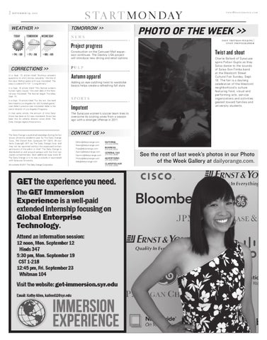 The Daily Orange is published weekdays during the Syracuse University academic year by The Daily Orange Corp., 744 Ostrom Ave., Syracuse, NY 13210. All contents Copyright 2011 by The Daily Orange Corp. and may not be reprinted without the expressed written permission of the editor in chief. The Daily Orange is distributed on and around campus with the first two copies complimentary. Each additional copy costs $1. The Daily Orange is in no way a subsidy or associated with Syracuse University. All contents © 2011 The Daily Orange Corporation