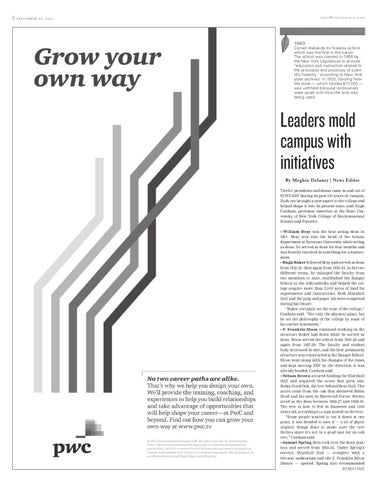Leaders mold campus with initiatives By Meghin Delaney | News Editor Twelve presidents and deans came in and out of SUNY-ESF during its past 100 years on campus. Each one brought a new aspect to the college and helped shape it into its present state, said Hugh Canham, professor emeritus at the State University of New York College of Environmental Science and Forestry. • William Bray was the first acting dean in 1911. Bray was also the head of the botany department at Syracuse University while acting as dean. He served as dean for four months and was heavily involved in searching for a replacement. • Hugh Baker followed Bray and served as dean from 1912-20, then again from 1930-33. In his two different terms, he enlarged the faculty from two members to nine, established the Ranger School in the Adirondacks and helped the college acquire more than 3,000 acres of land for experiments and instructions. Both Marshall Hall and the pulp and paper lab were completed during his tenure. “Baker certainly set the tone of the college,” Canham said. “Not only the physical plant, but he set the philosophy of the college by some of his earlier statements.” • F. Franklin Moon continued working on the structure Baker laid down while he served as dean. Moon served the school from 1920-26 and again from 1927-29. The faculty and student body increased in size, and the first permanent structure was constructed at the Ranger School. Moon went along with the changes of the times and kept moving ESF in the direction it was already headed, Canham said. • Nelson Brown secured funding for Marshall Hall and acquired the acorn that grew into Robin Hood Oak, the tree behind Bray Hall. The acorn came from the oak that sheltered Robin Hood and his men in Sherwood Forest. Brown acted as the dean between 1926-27 and 1929-30. The tree is now 10 feet in diameter and 1000 years old, according to a sign posted on the tree. “Some people wanted to cut it down at one point, it was decided to save it — a lot of physiological things done to make sure the tree thrives since it’s not in a good spot for an oak tree,” Canham said. • Samuel Spring then took over the dean position and served from 1933-44. Under Spring’s service, Marshall Hall — complete with a 500-seat auditorium and the F. Franklin Moon library — opened. Spring also recommended SEE NEXT PAGE