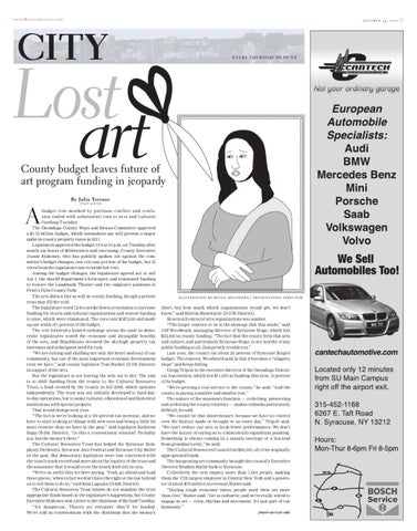 illustration by becca mcgovern | presentation director there, but how much which organizations would get, we don’t know,” said Martin Masterpole (D-17th District). Reaction from local arts organizations was somber. “The larger concern to us is the message that this sends,” said Jeff Woodward, managing director of Syracuse Stage, which lost $25,000 in county funding. “The fact that the county feels that arts and culture, and particularly Syracuse Stage, is not worthy of any public funding at all, that greatly troubles us.” Last year, the county cut about 20 percent of Syracuse Stage’s budget. The concern, Woodward said, is that it becomes a “slippery slope” and keeps falling. Gregg Tripoli is the executive director of the Onondaga Historical Association, which lost $11,000 in funding this year, 10 percent of its budget. “We’re proving a real service to the county,” he said. “And the county is paying a smaller and smaller cost.” The nature of the museum’s function — collecting, preserving and archiving the county’s history — makes cutbacks particularly difficult, he said. “We cannot be that discretionary because we have no control over the history made or brought to us every day,” Tripoli said. “We can’t reduce our sets or book fewer performances. We don’t have the luxury of saying no to a historically significant painting. Something is always coming in a manila envelope or a box-load from grandma’s attic,” he said. The Cultural Resources Council lost $60,000, all of its originally appropriated funds. The burgeoning art community brought the council’s Executive Director Stephen Butler back to Syracuse. Collectively the arts employ more than 1,000 people, making them the 17th largest employer in Central New York and a generator of about $70 million in revenue, Butler said. “During tough economic times, people need their art more than ever,” Butler said. “Art is cathartic, and we’re really wired to engage in art — color, rhythm and movement. It’s just part of our humanity.” jmterrus@syr.edu