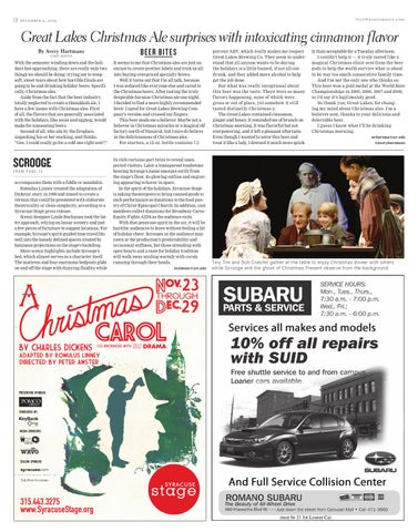 ly than acceptable for a Tuesday afternoon. I couldn’t help it — it truly tasted like a magical Christmas elixir sent from the beer gods to help the world survive what is about to be way too much consecutive family time. And I’m not the only one who thinks so. This beer won a gold medal at the World Beer Championships in 2005, 2006, 2007 and 2009, so I’d say it’s legitimately good. So thank you, Great Lakes, for changing my mind about Christmas ales. I’m a believer now, thanks to your delicious and delectable beer. I guess I know what I’ll be drinking Christmas morning. avhartma@syr.edu @averyhartmans