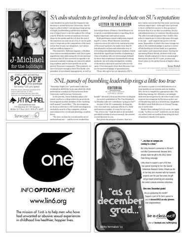 LET TER TO THE EDITOR beloved professor of history David Bennett in to speak to assemblymembers regarding these highly important and topical issues. Both gentlemen raised valid points regarding SU’s vision. While Bennett voiced his concerns about the selectivity and practicality of Syracuse’s policies, he made clear that SU has adopted a valiant and admirable way of recruiting and admitting future students. Saleh detailed the significant benefits of admitting a class of students who are increasingly defined by more than traditional standardized testing methods, but still acknowledged the validity of the metrics that most national schools rely upon. It becomes quite clear that this issue cannot be answered simply or quantitatively. Those who agree but are skeptical of SU’s