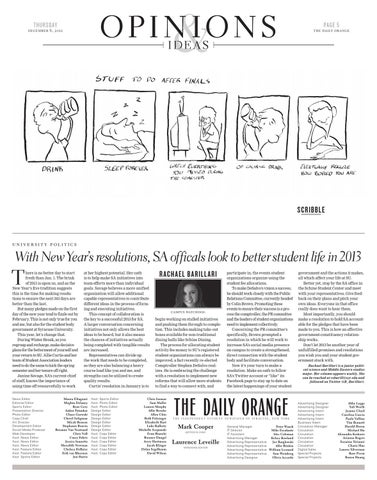 here is no better day to start fresh than Jan. 1. The brink of 2013 is upon us, and as the New Year’s Eve tradition suggests this is the time for making resolutions to ensure the next 365 days are better than the last. But many pledges made on the first day of the new year tend to fizzle out by February. This is not only true for you and me, but also for the student body government at Syracuse University. This year, let’s change that. During Winter Break, as you regroup and recharge, make decisive plans for the betterment of yourself and your return to SU. Allie Curtis and her team of Student Association leaders need to do the same to kick the spring semester and her tenure off right. Janine Savage, SA’s current chief of staff, knows the importance of using time off resourcefully to work News Editor Editorial Editor Sports Editor Presentation Director Photo Editor Copy Chief Art Director Development Editor Social Media Producer Web Developer Asst. News Editor Asst. News Editor Asst. News Editor Asst. Feature Editor Asst. Feature Editor Asst. Sports Editor