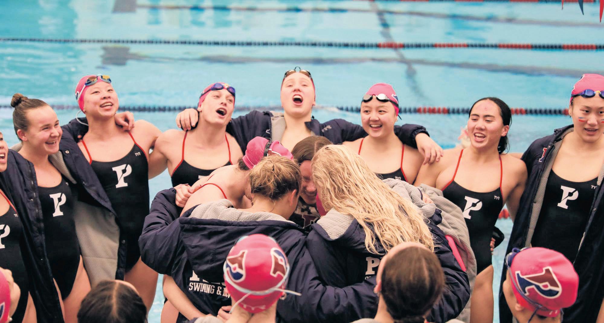 Penn women’s swimming and diving team pictured huddling on Nov. 1, 2025.
