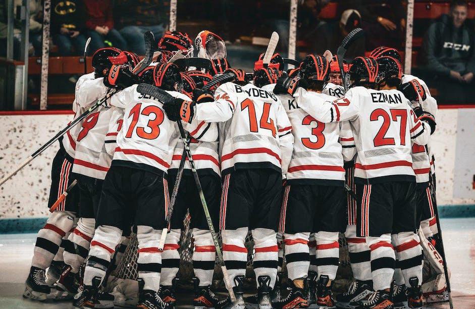 Men’s ice hockey gathered on the ice at Hobey Baker Rink.