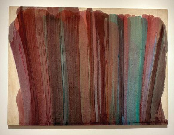 From a series of paintings known as the Veil paintings, “Intrigue” is a work from Morris Louis’ period of stylistic maturation. Familiar with his work, I recognized signature atmospheric colors, particularly hues layered upon one another with a harmonious lightness. The colors intermingle with both the material of the canvas and each other. Intrigue’s tones are muted while still engaging. Louis’ masterful manipulations of color led to an atmospheric and aura-like effect in the viewing experience, particularly arising from the manner in which they drip across the entirety of the canvas.