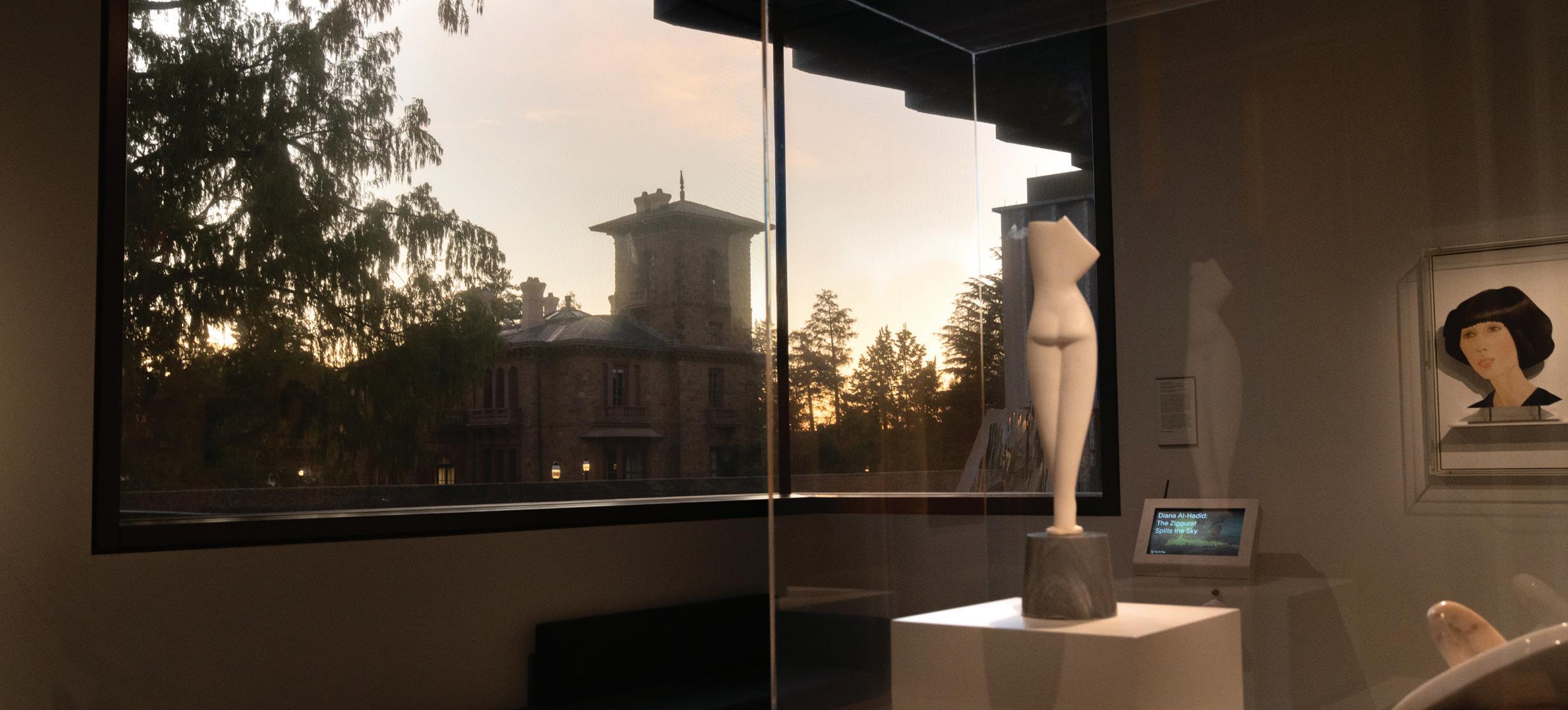 Above, glass walls exhibit a portion of the museum’s collection of ceramic trinkets, sculptures, and porcelain items on shelves. Natural lighting emanating from the gridded skylight ceiling illuminates the room in the daytime. At the front, a large projector display mostly remains black and dormant, but occasionally portrays graphics.