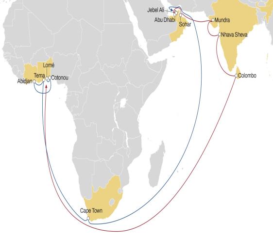 Jebel Ali – Abu Dhabi – Sohar – Mundra –Nhava Sheva – Colombo – Lome – Cotonou –Abidjan – Tema – Cape Town – Jebel Ali.