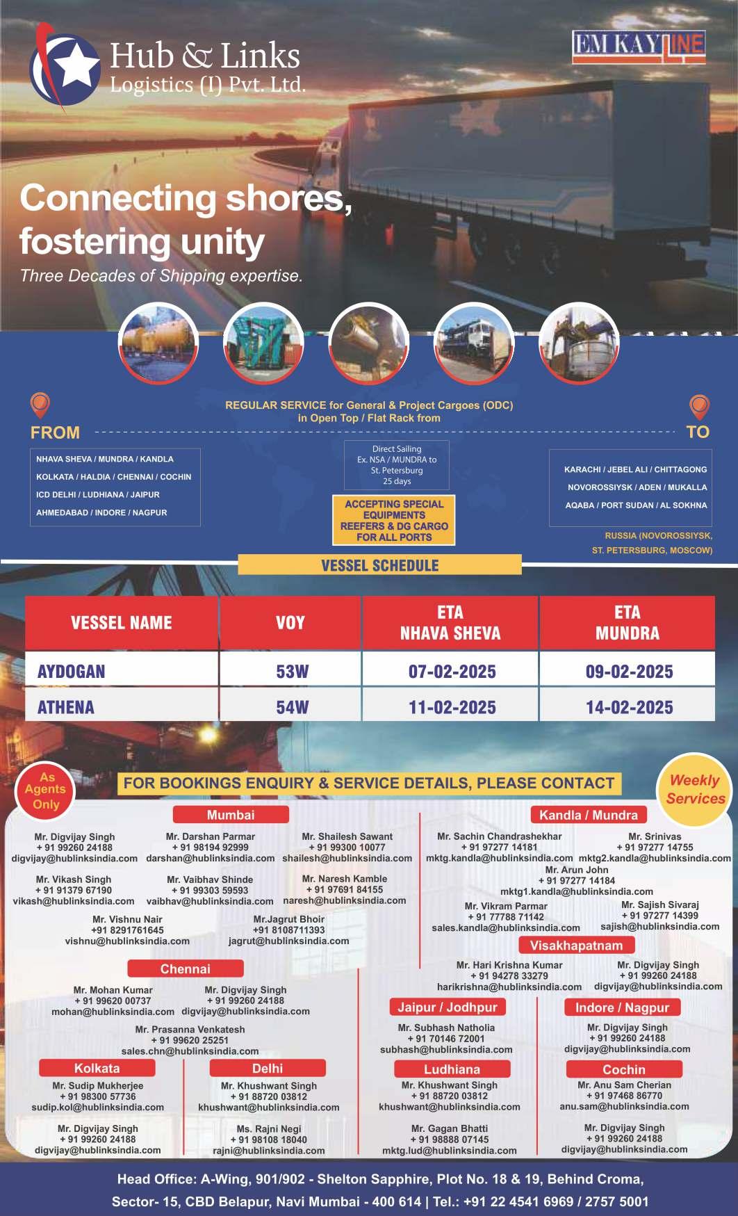 Spirit Of Kolkata (V-2502W)Nhava Sheva 31-01-2025 Marathopolis (V-505S) Ad Dammam 31-01-2025 Wan Hai 613 (V-67E) Port Kelang 01-02-2025