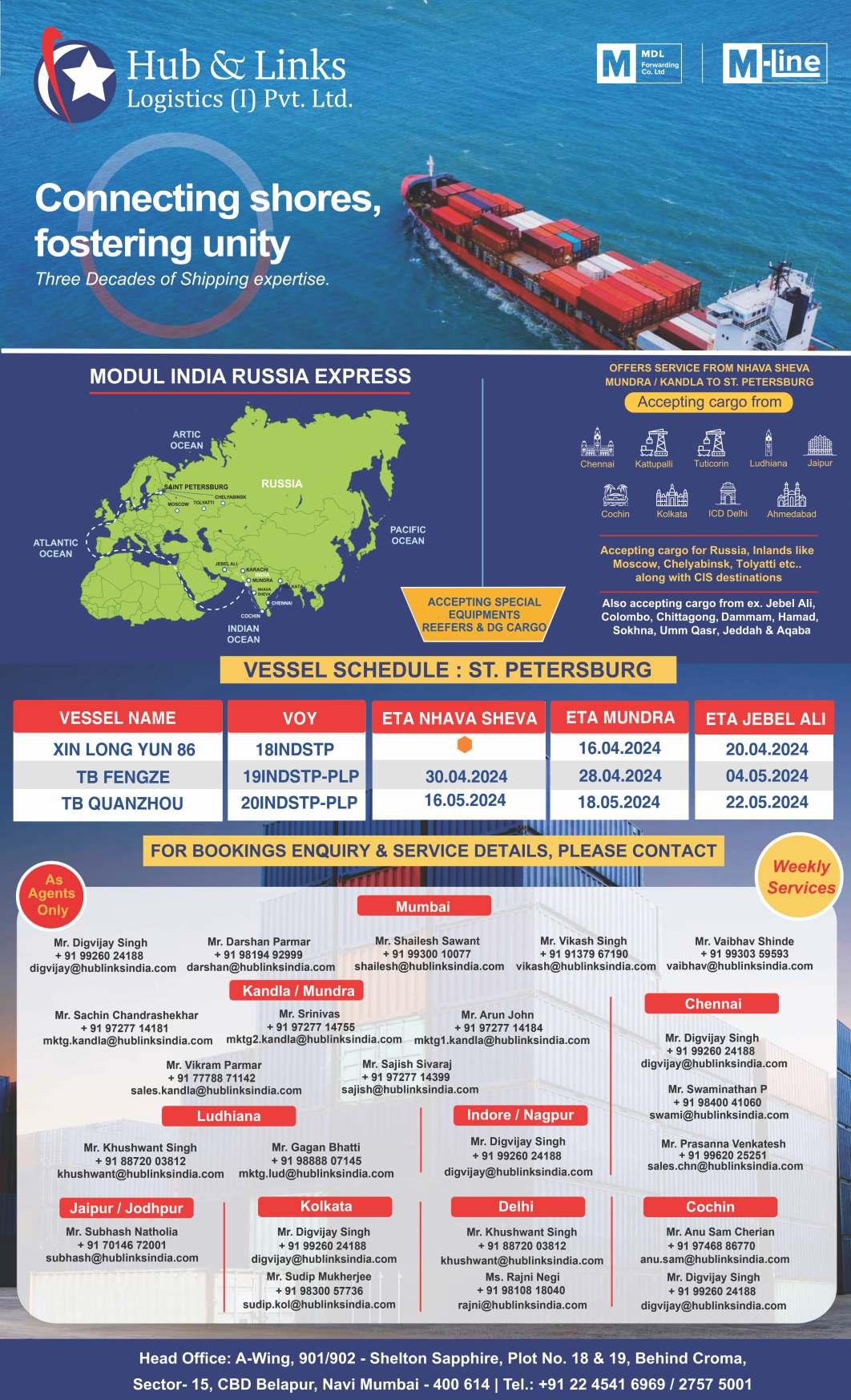 DUE AT NSFT/NSICT/NSIGT/GTI/BMCT FOR EXPORT LOADING 16/0417/04 TBATBA APL Cairo 0UW2DW1 Q0060 294877-04/04 CMA CGM CMA CGM Ag. Chittagong Dron-3 & Mul 24/0425/04 TBATBA Spil Citra 0UW1CW1 Q0127 295378-12/04 OOCL OOCL (I) (Bangladesh India Gulf Express) 19/0420/04 TBATBA Volans 2416W ONE Line ONE (India) Colombo. 30/0401/05 TBATBA Spil Kartika 2417W Hapag ISS Shpg. (AIM) ULA CFS TO LOAD FOR INDIAN SUB CONTINENT from NSICT 16/0417/04 TBATBA Wadi Duka 2407W Q0052 294845-04/04 Asyad Line Seabridge Karachi 16/0417/04 TBATBA Maersk Iyo 415W Q0018 294610-01/04 CMA CGM CMA CGM Ag. Colombo (MESAWA) Dronagiri 16/0417/04 TBATBA Ever Excel 173E Q0006 294570-01/04 Evergreen Evergreen Shpg. Colombo. Balmer Law. CFS Dron. 22/0423/04 TBATBA Ever Ethic 167E Q0069 294907-05/04 UnifeederUnifeeder Colombo. Dronagiri 29/0430/04 TBATBA Shimin 20E ONE Line ONE (India) Colombo. (CISC Service) 06/0507/05 TBATBA Seattle Bridge 089E CSC Seahorse Colombo. 19/0420/04 TBA 1500 MSC Antonia IV416A Q0113 295233-10/04 MSC MSC Agency Colombo. (INDUSA) Hind Terminal TO LOAD FOR INDIAN SUB CONTINENT from NSIGT 17/0418/04 17/04 1500 MSC Katie FD410E Q0085 295074-08/04 MSC MSC Agency Colombo. (DRAGON EB) Hind Terminals 17/0418/04 17/04 1000 MSC Alba F IU415A Q0103 295197-09/04 MSC MSC Agency Karachi. (INDUS) Hind Terminals TO LOAD FOR INDIAN SUB CONTINENT from GTI 16/0417/04 TBATBA One Arcadia 0068E Q0005 294574-01/04 ONE Line ONE (India) Colombo. 22/0424/04 TBATBA Conti Conquest 0027E Q0116 265264/10-04 Yang Ming Yang Ming(I) Contl.War.Corpn. 28/0430/04 TBATBA Conti Crystal 0136E Hapag/CSC ISS Shpg/Seahorse ULA CFS/ (PS3 Service) HMM HMM Shpg. Seabird CFS 18/0420/04 TBATBA Cap Andreas 010E Q0038 294652-01/04 ONE Line ONE (India) Colombo. 21/0423/04 TBATBA San Francisco Bridge 071E X-Press Feeders Sea Consortium Colombo. Dronagiri 28/0429/04 TBATBA X-Press Bardsey 24003E CSC Seahorse Colombo. (TIP Service) HMM HMM Shpg. Colombo. Seabird CFS 18/0420/04 TBATBA OOCL Hamburg 149E P2928 294197-26/03 OOCL OOCL (I) Colombo. GDL 23/0425/04 TBATBA OOCLLuxembourg 109E Q0051 294811-03/04 Star Line Asia Seahorse Yangoon. (CIX-3) Dronagiri-3 19/0421/04 TBATBA Interasia Progress E082 Q0063 294880-04/04 Wan Hai Wan Hai Lines Colombo. (CI2) Dron-1 & Mul CFS TO LOAD FOR INDIAN SUB CONTINENT from BMCT In Port 16/04 MSC Tokyo GA415R P2942 294308-27/03 MSC MSC Agency Colombo (SENTOSA SHIKRA) Hind Terminal 15/0416/04 MSC Giovanna XA415A Q0108 295159-09/04 MSC MSC Agency Colombo (IAS SERVICE) Hind Terminal 18/0419/04 TBATBA Xin Beijing 144E P2894 293958-22/03 COSCO COSCO Shpg. Karachi, Colombo. (CI 1) 19/0420/04 18/04 1200 Maersk Cuanza 416W Q0052 29479-03/04 Maersk Line Maersk India Colombo (MW2) Maersk CFS 19/0420/04 TBATBA ACX Diamond 324W Q0117 295273-10/04 Samudera Samudera Shpg. Colombo (SIG) Dronagiri 19/0420/04 TBATBA X-Press Pisces 24003E Q0035 294675-02/04 ONE/KMTC ONE(I)/KMTC(I) Karachi, Colombo —/Dron-3 21/0422/04 TBATBA Zhong Gu Nan Ning 2402E Q0062 294798-04/04 X-Press Feeders SeaConsortium (CWX/CIX5) 30/0401/05 TBATBA One Matrix 088E TS Lines/PIL TS Lines(I)/PIL India Dronagiri-2/— 22/0423/04 TBATBA Zoi 113E Q0027 294641-01/04 Evergreen Evergreen Shpg. Colombo Balmer Law. CFS Dron. 27/0428/04 TBATBA KMTC Dubai 2402E Q0125 295367-12/04 KMTC/Gold Star KMTC(I)/Star Ship Dronagiri-3/— 04/0505/05 TBATBA Ever Elite 166E X-Press Feeders SeaConsortium (NIX Service) 10/0510/05 TBATBA Pusan 31E EmiratesEmirates Dronagiri-2 TO LOAD FOR FAR EAST, CHINA & JAPAN PORTS from NSFT 15/0416/04 Lotus A 0FFBCE1 P2946 294403-28/03 CMA CGM CMA CGM Ag. Singapore, Qingdao, Shanghai, Ningbo, Shekou Dron-3 & Mul 23/0424/04 TBATBA CMA CGM Nabucco 0FFBEE1 Q0081 RCL RCL Ag. (AS 1) TO LOAD FOR FAR EAST, CHINA & JAPAN PORTS from NSICT 16/0417/04 16/04 1800 BLPL Trust 1404E Q0026 294642-01/04 BLPL Transworld GLS Far East Ports. 16/0417/04 TBATBA Ever Excel 173E Q0006 294570-01/04 Evergreen Evergreen Shpg. P.Kelang, Tanjun, Pelepas, Singapore, Xingang, Balmer Law. CFS Dron. 22/0423/04 TBATBA Ever Ethic 167E Q0069 294907-05/04 UnifeederUnifeeder Qingdao, Shanghai, Ningbo. Dronagiri 29/0430/04 TBATBA Shimin 20E PIL/ONE PIL India/One(I) —/— 06/0507/05 TBATBA Seattle Bridge 089E Hapag ISS Shpg. P.Kelang, Singapore, Xiangang, Qingdao, Shanghai, Ningbo, Da Chan Bay. ULA CFS 13/0514/05 TBATBA Ever Sigma 126E KMTC KMTC (I) P.Kelang,Singapore,Tanjung Pelepas,Xiangang,Qingdao,Laem Chabang. Dronagiri-3 20/0521/05 TBATBA Celsius Naples 902E TS Lines TS Lines (I) P.Kelang,Singapore,Tanjung Pelepas,Xiangang,Qingdao,Laem Chabang. Dronagiri-2 (CISC Service) HMM HMM Shpg. P.Kelang(S), Singapore, Xiangang,Qingdao, Kaohsiung. Seabird CFS Samudera Samudera Shpg. P.Kelang,Singapore,Tanjung Pelepas,Xiangang,Qingdao,Laem Chabang. Dronagiri CU Lines Seahorse Ship Port Kelang, Singapore, Haiphong, Qingdao, Shanghai, Ningbo. BSS Bhavani Shpg. Port Kelang, Singapore, Jakarta, Yangoon, Surabaya, Belawan, Ashte CFS 17/0418/04 17/04 1500 MSC Katie FD410E Q0085 295074-08/04 MSC MSC Agency Dalian, Shanghai, Ningbo, Yantian. Hind Terminals 23/0424/04 TBATBA MSC Anita FD411E (DRAGON EB) 19/0420/04 TBATBA Terataki 2405E P2940 294307-27/03 Asyad Line Seabridge Haiphong, Laem Chabang, Port Kelang (IEX) 26/0427/04 TBATBA GFS Giselle 2404E P2925 294144-26/03 Global Feeder Sima Marine Port Kelang, Shekou, Shanghai, Ningbo (CSC) Dronagiri 01/0502/05 TBATBA Grace Bridge 2403E Heung A Line Sinokor India 08/0509/05 TBATBA Ren Jian 23 Sinokor Sinokor India Seabird CFS 19/0520/05 TBATBA Beijing Bridge 2403 TS Lines TS Lines (I) (CSC) Cordelia Cordelia Cont. Port Kelang, Far East & China Ports Blue Water PoseidonShpg. Shanghai, Ningbo, Qingdao. Speedy CFS