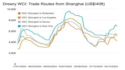 Similarly, rates from Shanghai to New York fell 4% or $260 to $6,825 per 40ft container Likewise, rates from Shanghai to Rotterdam dropped 3% or $144 to $4,231 per 40ft container Those from Shanghai to Genoa also reduced 2% or $124 to $5,086 per 40ft container, and rates from Rotterdam to Shanghai shrank 1% or $4 to $518 per 40ft container. Conversely, spot rates from Rotterdam to New York increased 4% or $100 to $2,798 per 40ft container. Similarly, rates from Los Angeles to Shanghai rose 1% or $6 to $725 per 40ft container. Meanwhile, rates from New York to Rotterdam remained stable Drewry expects spot rates to decrease slightly in the coming weeks due to increased capacity