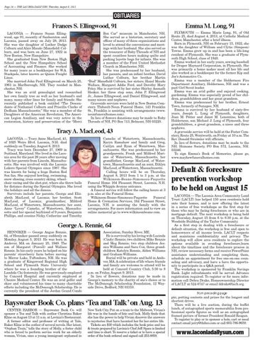 Box Car” museum in Manchester, NH. She served as a historian, secretary and officer of many of these organizations and loved to attend the conventions and meetings with her husband. She also served as the treasurer of Baby Threads of NH and spent countless hours making quilts and packing layette bags for infants. She was a member of the First United Methodist Church in Manchester, NH. She was predeceased by her husband, her parents, and an infant brother, David Luther Colburn, her brother Martin “Bud” Mansfield Colburn, her sisters; Hazel Maude Wallace, Margaret Addie Ford, and Dorothy Mary Foley. She is survived by her sister Shirley Asenath Hooker, her three step sons, John P. Ellingwood Jr., James Ellingwood, and Daniel Ellingwood, and many nieces and nephews. Graveside services were held in New Boston Cemetery. Thibault-Neun Funeral Home, 143 Franklin St., Franklin is assisting with arrangements (www. neunfuneralhomes.com). In lieu of flowers donations may be made to Baby Threads of NH, PO Box 713, Belmont, NH 03220.