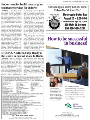 New Hampshire, Rhode Island and Vermont, providing residential and commercial real estate. Read more about the industry at the RE/ MAX of New England blog at www. remax-newengland.com and follow us on Twitter at @REMAXNE. RE/MAX is proud to help raise millions of dollars and support charitable organizations like, Susan G. Komen For the Cure and Children’s Miracle Network Hospitals.