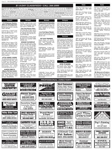 $1-A-DAY CLASSIFIEDS • CALL 356-2999 DOLLAR-A-DAY NON-COMMERCIAL: Ad must run a minimum of 6 consecutive days. Ads over 15 words add 10¢ per word per day. COMMERCIAL RATE: $2 a day; 10¢ per word per day over 15 words. PREMIUMS: First word caps no charge. Additional caps 10¢ per word per day. Centered bold heading: 9 pt. caps 40¢ per line, per day (2 lines maximum) TYPOS: Check your ad the first day of publication. Sorry, we will not issue credit after an ad has run once. DEADLINES: noon, one business day prior to the day of publication. PAYMENT: All private party ads must be pre-paid. We accept checks, Visa and Mastercard credit cards and of course cash. There is a $10 minimum order for credit cards. CORRESPONDENCE: To place your ad call our offices 8:30 a.m. to 5 p.m., Monday through Friday, 356-2999; send a check or money order with ad copy to The Conway Daily Sun, P.O. Box 1940, North Conway, N.H. 03860, email ad to classified@conwaydailysun.com or stop in at our offices on Seavey Street in North Conway village. OTHER RATES: For information about the professional directory or classified display ads call Jamie or Hannah at 356-2999.