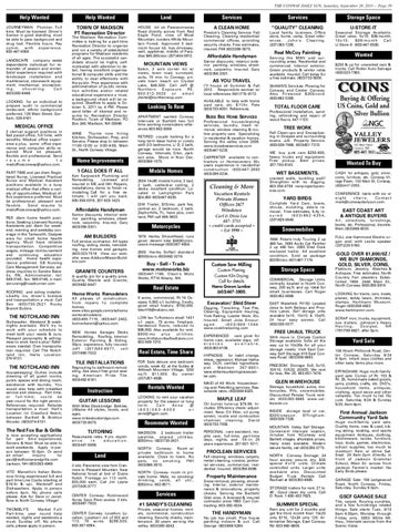 Excavator/ Skid Steer Digging, Trenching, Test Pits, Clearing, Equipment Hauling, York Raking, Loader Work, Etc. Insured. Small Jobs Encouraged. (603)986-1084. www.cooklineboring.com EXPERIENCED care giver for home care, available days, references available, (603)383-6106. HYPNOSIS for habit change, stress, regression. Michael Hathaway, DCH, certified hypnotherapist. Madison 367-8851. www.whitemountainhypnosiscenter.com. MAID of All Work- Houseclean ing and Petsitting services. Reasonable rates. (603)569-6325.