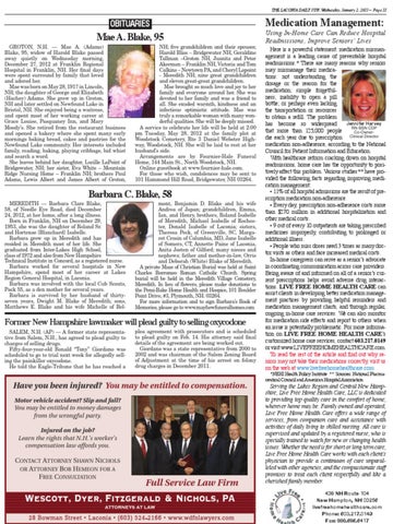 MEREDITH — Barbara Clare Blake, 58, of Needle Eye Road, died December 24, 2012, at her home, after a long illness. Born in Franklin, NH on December 29, 1953, she was the daughter of Roland Sr. and Hortense {Blanchard} Isabelle. Barbara grew up in Meredith and has resided in Meredith most of her life. She graduated from Inter-Lakes High School, class of 1972 and also from New Hampshire Technical Institute in Concord, as a registered nurse. Barbara worked for several hospitals in New Hampshire, spend most of her career at Lakes Region General Hospital, in Laconia. Barbara was involved with the local Cub Scouts, Pack 55, as a den mother for several years. Barbara is survived by her husband of thirtyseven years, Dwight M. Blake of Meredith; sons, Matthews E. Blake and his wife Michelle of Bel-