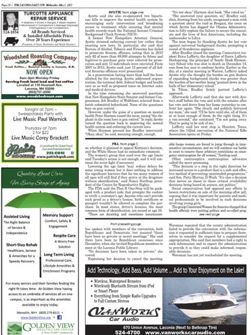 AYOTTE from page one Ayotte said she also co-sponsored two bipartisan bills to improve the mental health system by encouraging early intervention and broadening access to treatment while ensuring that mental health records reach the National Instant Criminal Background Check System (NICS). A former New Hampshire Attorney General, Ayotte stressed enforcing current law rather than enacting new laws. In particular, she said that Bureau of Alcohol, Tobacco and Firearms has failed to prosecute firearm offenses, noting that in 2010 only 62 of more than 49,000 attempts by felons and fugitives to purchase guns were referred for prosecution and only 13 individuals were convicted. From 2007 to 2011, Ayotte said, just 13 percent of all federal firearms offenses were prosecuted. In a presentation lasting more than half the hour allotted for the meeting, Ayotte addressed sequestration, the national debt, federal budget and health care as as well as proposed taxes on Internet sales and medical devices. In the time remaining she answered questions that New Hampshire State Senator and former Congressman Jeb Bradley of Wolfeboro selected from a batch submitted beforehand. None of the questions bore on gun control. However, under the guise of a question on mental health Peter Harmon raised the issue, saying “the elephant in the room here is gun control.” In reply, Ayotte turned the question back to improving the mental health system and enforcing the current laws. When Harmon pressed her Bradley intervened. “Okay, okay,” he said, meaning enough, enough.
