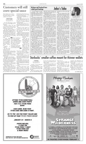 the temptation of fast food even easier for us to fall victim to by creating the dollar and value menus. Fast food fits comfortable into a college budget. If you only have $3 in your pockBy Melissa Pollard et and a half hour before class, you Daily Titan Staff Writer don't have the time or money to opinion@dailytitan.com sit down at a restaurant and order Fast food. We all know it is bad something healthy. But that same $3 will buy you a for us, yet we keep falling into the full meal off the dollar menu at Mctemptation. Starting in March, New York Donald's, and you won't be late for City's fast food restaurants will be class. Placing the calorie amounts on required to show the calorie count fast food menus may affect a few for all items on their menus. The New York City Board of customers, but it won't stop them Health passed a regulation that re- from eating what they want and quires all fast food chains with 15 or where they want. After the new menus are up, there more locations in New York to post the calorie amounts on their menus. will likely be a decline in the number So with the calories being out in of patrons going to fast food restauthe open for us to see, are we going rants, but it will be only a small decline and for only a to stop eating fast short time. food? If you only have There will be I don't think those people that that showing us the $3 in your pocket stop going for amount of calories and a half hour before will a few weeks, maybe we eat is going to a month at most. stop us from order- class, you don’t have They will come ing a Big Mac or the time or money to realize how unChicken McNugto sit down at a healthy the food gets. really is, but will Customers are restaurant and order eventually get past not idiots. something healthy. it and go back to We don't need eating fast food the to know how many same way they did calories are in an order of french fries to understand that before the new menus went up. There may also be a change in they are unhealthy and that people what customers order when going to shouldn't be eating them. So if we know that fast food is fast food restaurants. With the calorie amounts of all unhealthy, why do we keep coming the food and beverages easily availback for more? able to them, some will want to take Two reasons: time and money. My biggest excuse for eating fast the heathy route and order a salad or food is that it fits into my schedule a lettuce wrap. These people will still visit fast and, like me, there are many of us out there that are both full-time stu- food restaurants, they will just order the items with the least amount of dents and full-time employees. Sitting down to a home-cooked calories, thinking they are still eating meal just doesn't always fit into the healthy. Fast food chains have been around breaks we have in our lives. Going through a drive-thru to for years. It's hard to drive down a main grab dinner or lunch before class is much more convenient than sitting highway anywhere in the country down at a restaurant and ordering a and not see a Carl's Jr. or Taco Bell on every corner and this isn't going potentially healthier meal. Fast food chains such as McDon- to change just because calories are ald's and Wendy's have also made being displayed on the menus.