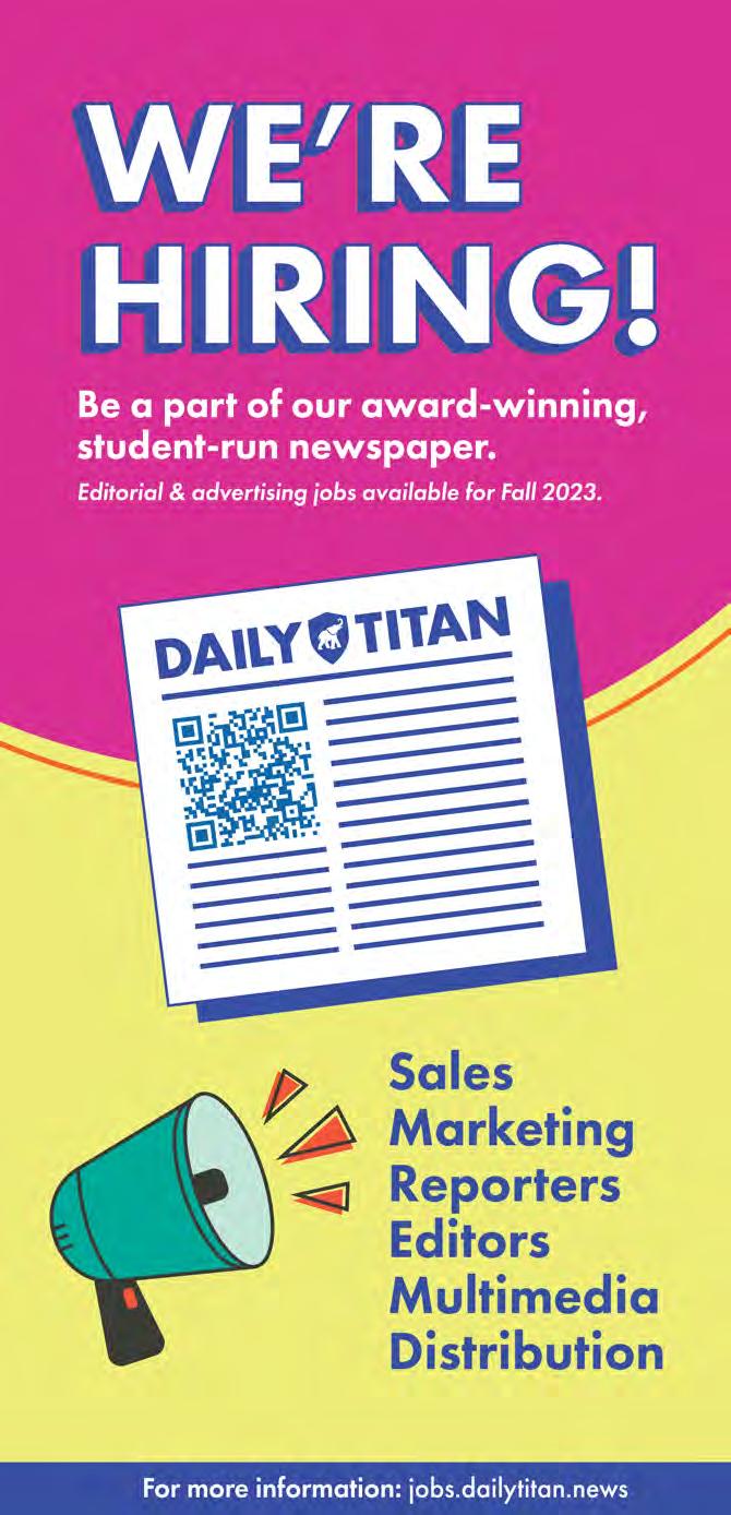 VISIT US AT: DAILYTITAN.COM FOLLOW US: @THEDAILYTITAN The Student Voice of California State University, Fullerton Volume 113 Issue 12 Monday, April 17, 2023 WHAT’S INSIDE? Lifestyle 4 Five grad photo spots Sports 7 Softball takes first place "Euphoria"