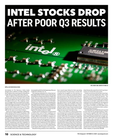 increasing from $49.10 at the beginning of the year to $81.96 as of Friday, Oct. 23. The Oregonian reported on Oct. 19 that Intel additionally sold their NAND memory chip business to South Korea-based semiconductor supplier SK Hynix. The move allows Intel to focus primarily on the production and development of their nextgeneration CPUs by pulling them out of the flashmemory race. They are, however, keeping their line of Optane storage drives. Hynix’s acquisition of NAND represents Intel’s continued efforts to offload their periphery businesses following last year’s report by CNBC that the company was selling their 5G modem business to Apple. Despite Intel’s headquarters being located in Santa Clara, most of their employees are stationed at their local campuses in Hillsboro, Oregon. Efforts at the Hillsboro campuses are primarily directed towards the production, manufacturing and development of microprocessors. As such, the offloading of NAND is unlikely to affect employment at the Hillsboro campuses. However, recent talks regarding outsourcing of microprocessor manufacturing could majorly affect Oregon’s tech economy. Manufacturing problems from within Intel